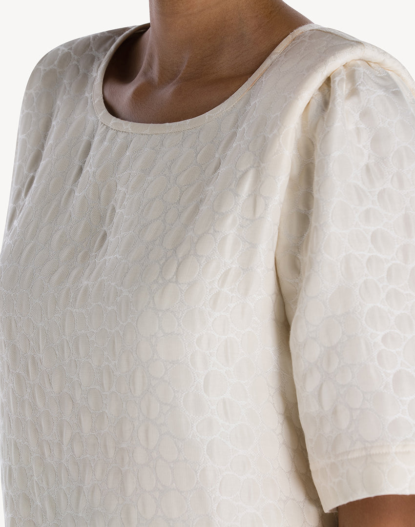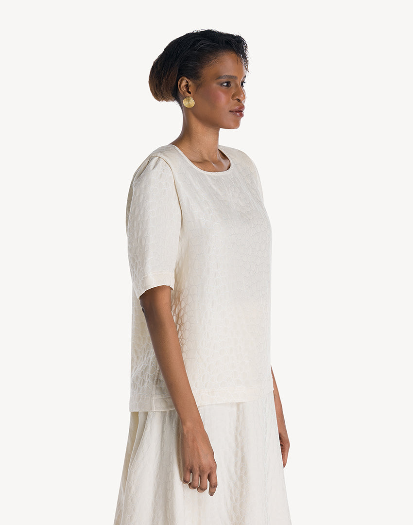 Nala T-shirt is crafted from medium weight silk blend fabric. It features padded shoulders for a contemporary look. An essential must have in a wardrobe for a timeless elegance